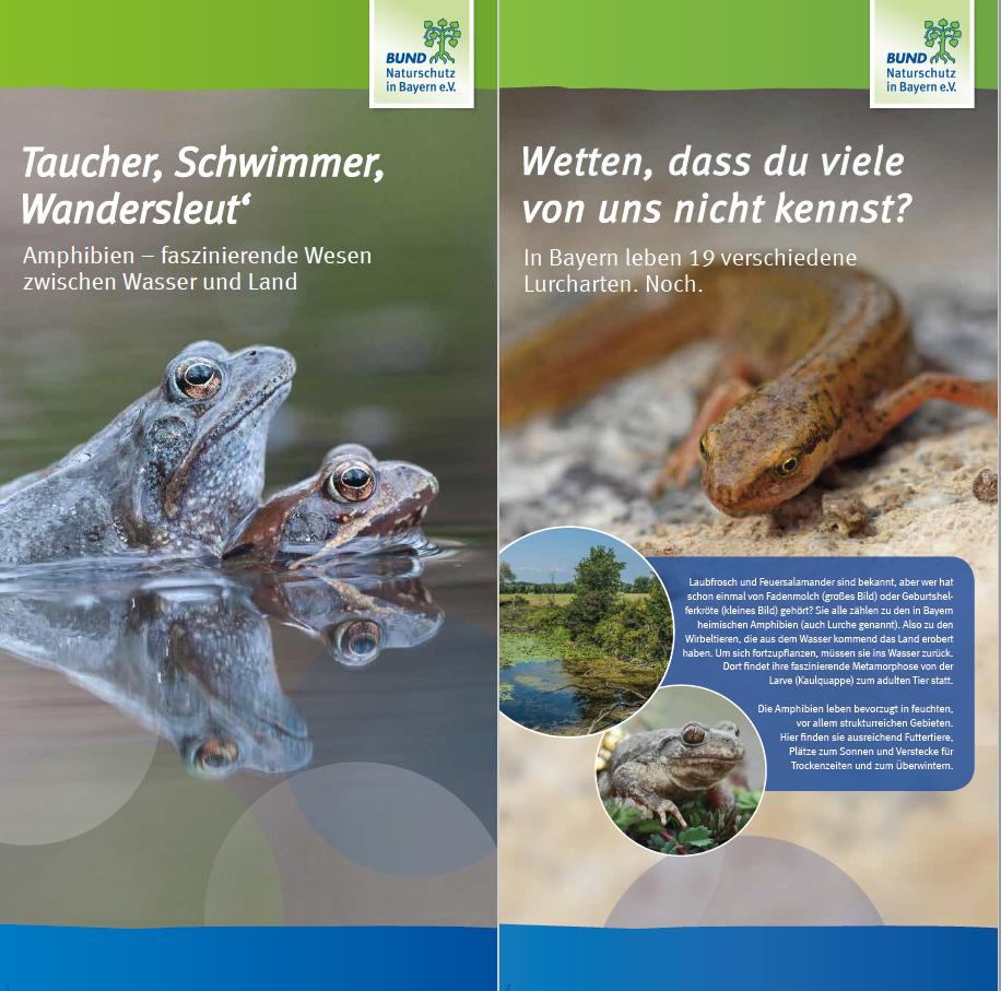 Die Ausstellung Amphibien zeigt in 12 Rollups die faszinierenden Wesen zwischen Wasser und Land wie Laubfrosch und Feuersalamander, Fadenmolch und Geburtshelferkröte. Die Amphibien leben bevorzugt in feuchten, vor allem strukturreichen Gebieten. Hier finden sie ausreichend Futtertiere, Plätze zum Sonnen und Verstecke für Trockenzeiten und zum Überwintern. Aber Umwelteinflüsse, Straßenverkehr & Co. bedrohen die Amphibien, deren Rettung der seit Jahrzehnten ein zentrales Anliegen des BUND Naturschutz ist.