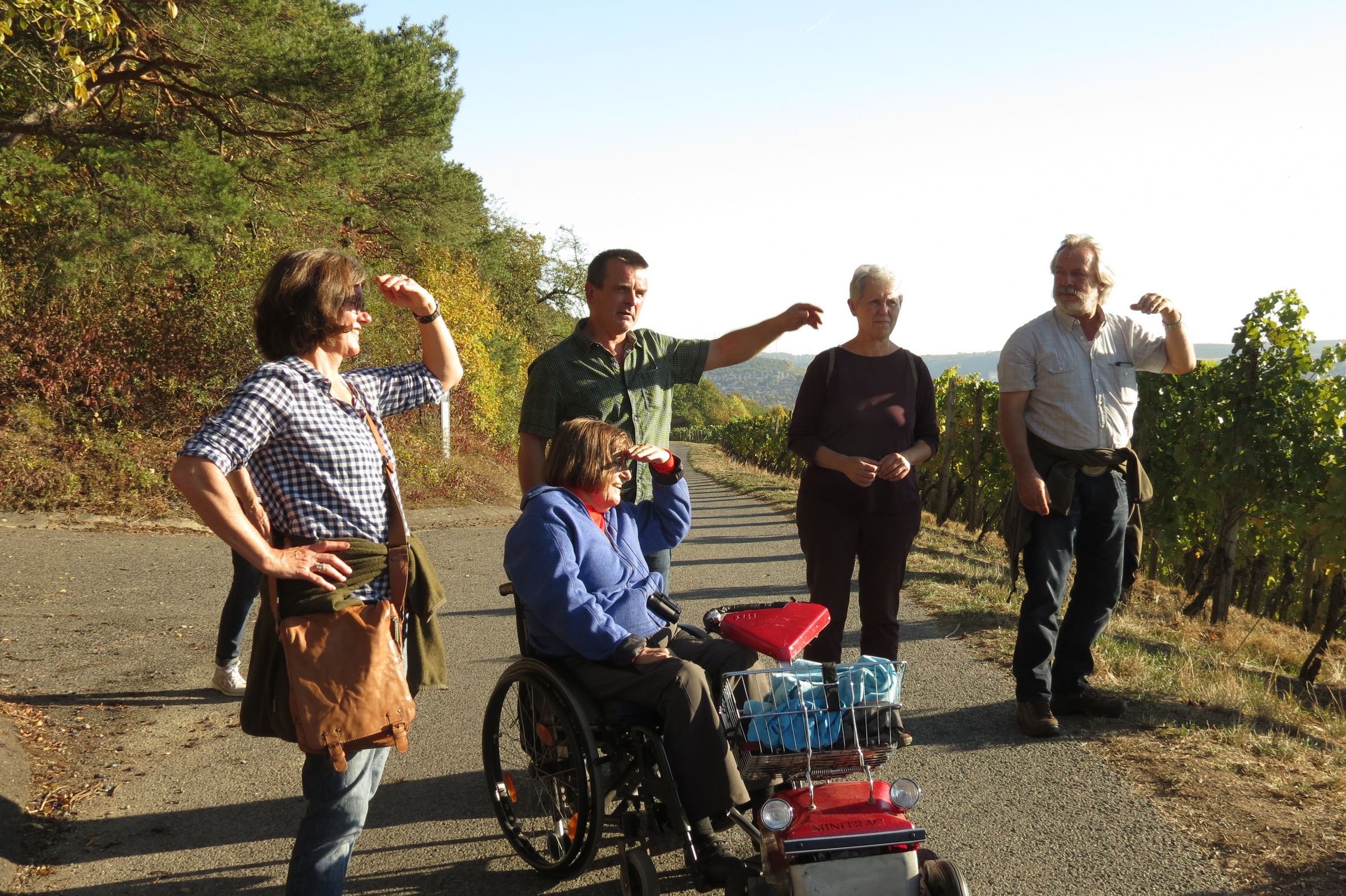 Auf der anschließenden Wanderung durch die Weinberge konnte Joachim Hörnig sehr anschaulich auf die Unterschiede zwischen konventionellem Weinbau und im Hinblick auf Biodiversität bewirtschaftete Flächen der LWG hinweisen. Ein wesentliches Element dieser Bewirtschaftung ist die Querterrassierung an besonders steilen Lagen. Wird die Bewirtschaftung aufgrund der hier besonders schwierigen Produktionsbedingungen komplett aufgegeben, geht durch Verbuschung ein wichtiger Lebensraum für viele speziell angepasste Tiere verloren. Durch die Querterrassierung konnte die LWG den Weinbaustandort in diesen Lagen erhalten, wenn auch mit einem geringeren Ertrag. Profiteure sind zum Teil seltene, aber für die Region bedeutende Arten wie die Blaue Holzbiene und die Rotflügelige Ödlandschrecke, aber auch Falter wie der auf der Roten Liste stehende Schwalbenschwanz oder der Segelfalter, dessen Vorkommen inzwischen stark gefährdet ist.