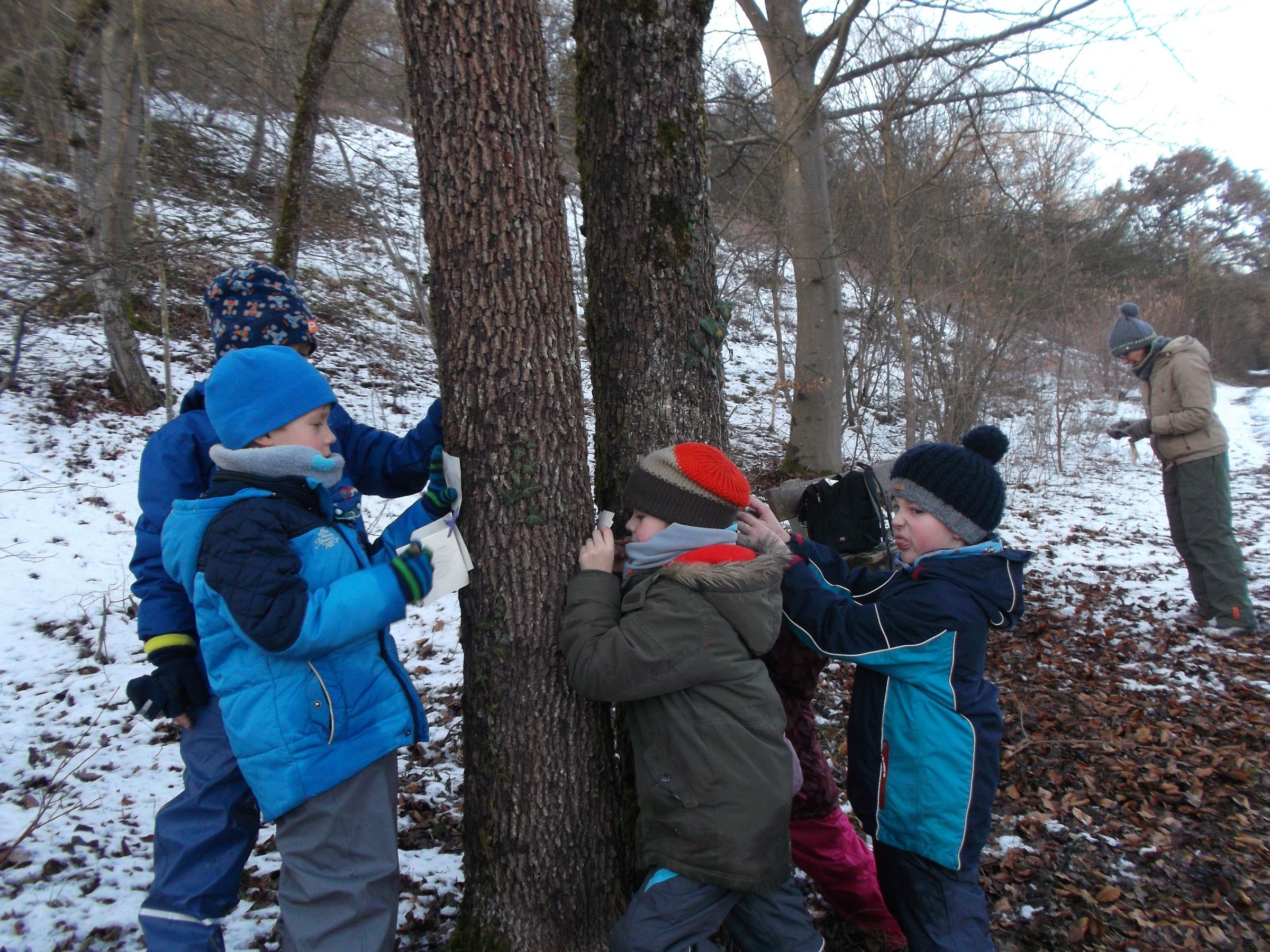 Was sind Baummäntel? fragten sich beim Februartreffen die Waldwichtel in Himmelstadt. Die Kinder trugen alle dicke Jacken. Auch die Bäume schützen sich durch ihre Mäntel, sozusagen. Die Rinde. Wichtig für die Bäume. Und ein gutes Unterscheidungsmerkmal für die Bestimmung der Bäume. Deshalb fertigten sich die Kinder ein Baumsteckbriefbüchlein an. Dazu pausten sie mit Papier und Bleistift die Rinde ab. Spannend für die Kinder, um Beobachtung und Aufmerksamkeit zu trainieren. Am Ende des Treffens versorgten die Kinder noch die Wintervögel auf einer Streuobstwiese mit Vogelfutter.