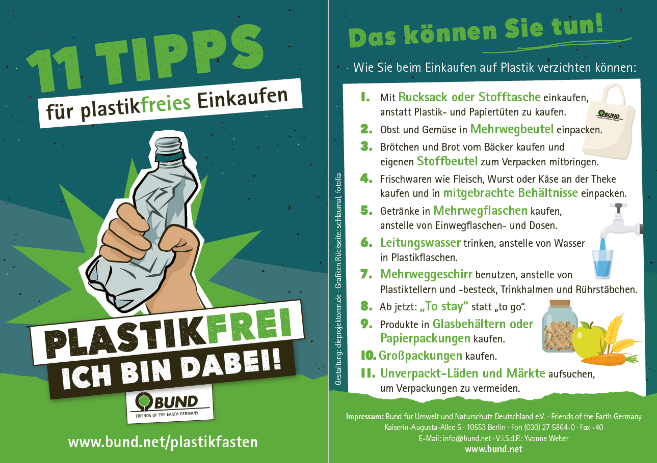 Raus aus dem Plastikwahn: #plastikfasten jetzt! unter diesem Motto ruft auch 2020 der BUND wieder dazu auf, in der Fastenzeit unter #plastikfasten Erfahrungen, Tipps und Ideen rund um einen Alltag ohne Plastik in den sozialen Medien zu teilen. Helfen Sie, mit Ihrem Know-how eine plastikfreiere Zukunft zu gestalten!