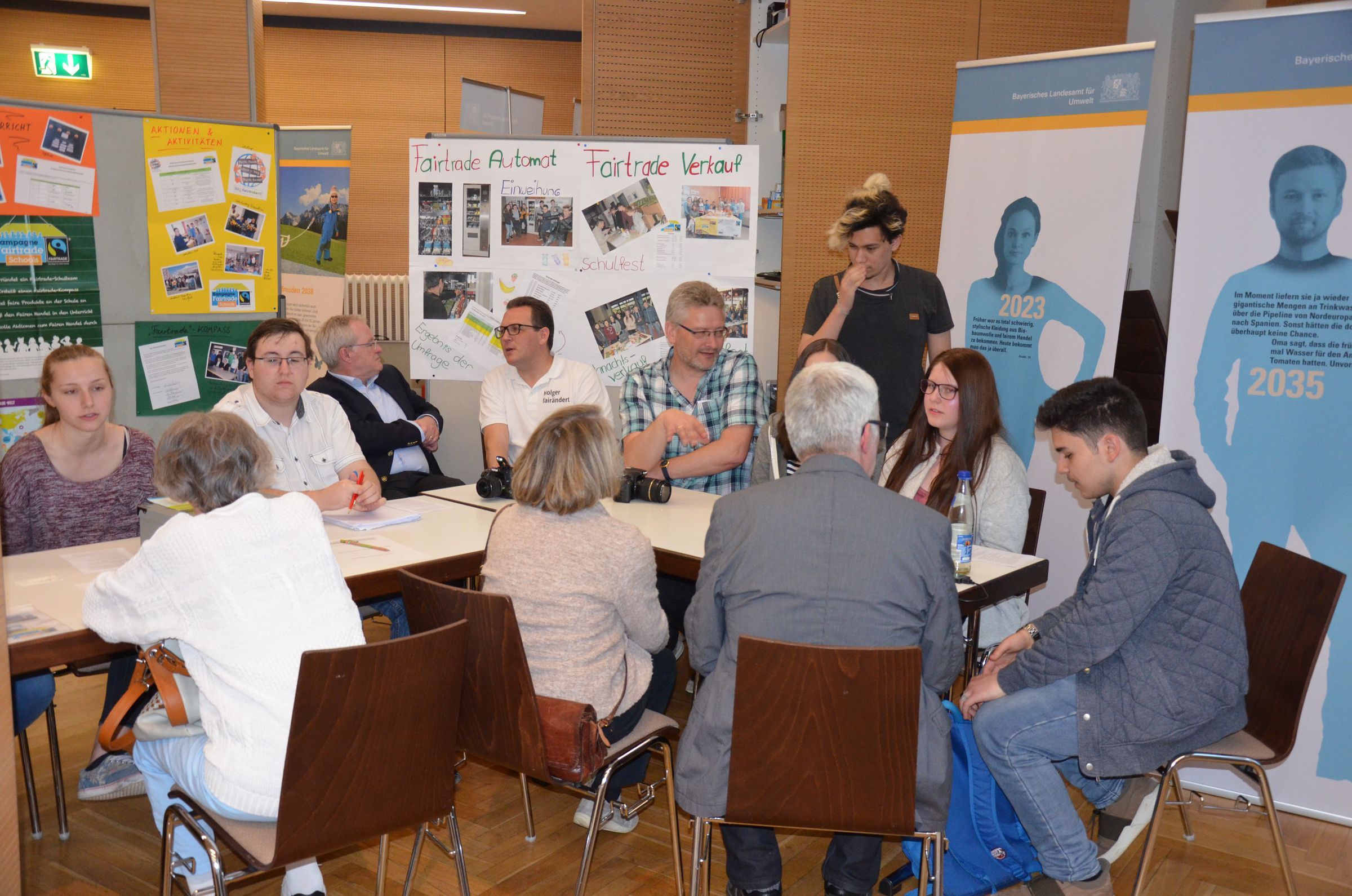 Großen Beifall brachte die Teilnahme der Fair-Trade-Schulen Balthasar-Neumann-Gymnasium und Mittelschule. Mit großer Besetzung um ihre Lehrer Holger Seidel und Wolfgang Schmitt präsentierten sie ihre Aktionen zum fairen Handel und waren dankbar für Impulse für neue Aktionen und Projektvorschläge. Schön war zu hören, dass sich hier die jungen Akteure bereits Gedanken machen, wie es über die eigene Schulzeit hinaus weiter gehen kann. Beim Vegetarierbund Marktheidenfeld und Frau Regina Leshel wurde deutlich, dass ein Klima-, Tier- und Gesundheitsschutz mit Messer und Gabel machbar ist, dass aber eine Ernährungsumstellung auch dauert. Hier besteht noch viel Informationsbedarf in der Bevölkerung. Beim Weltladen mit Christina Schlembach und Heinz Großhans zeigte sich, dass man Angebot und Aktionen bereits gut kennt, aber sich immer wieder von Neuem vornehmen muss, die Einkäufe auch dort zu erledigen.