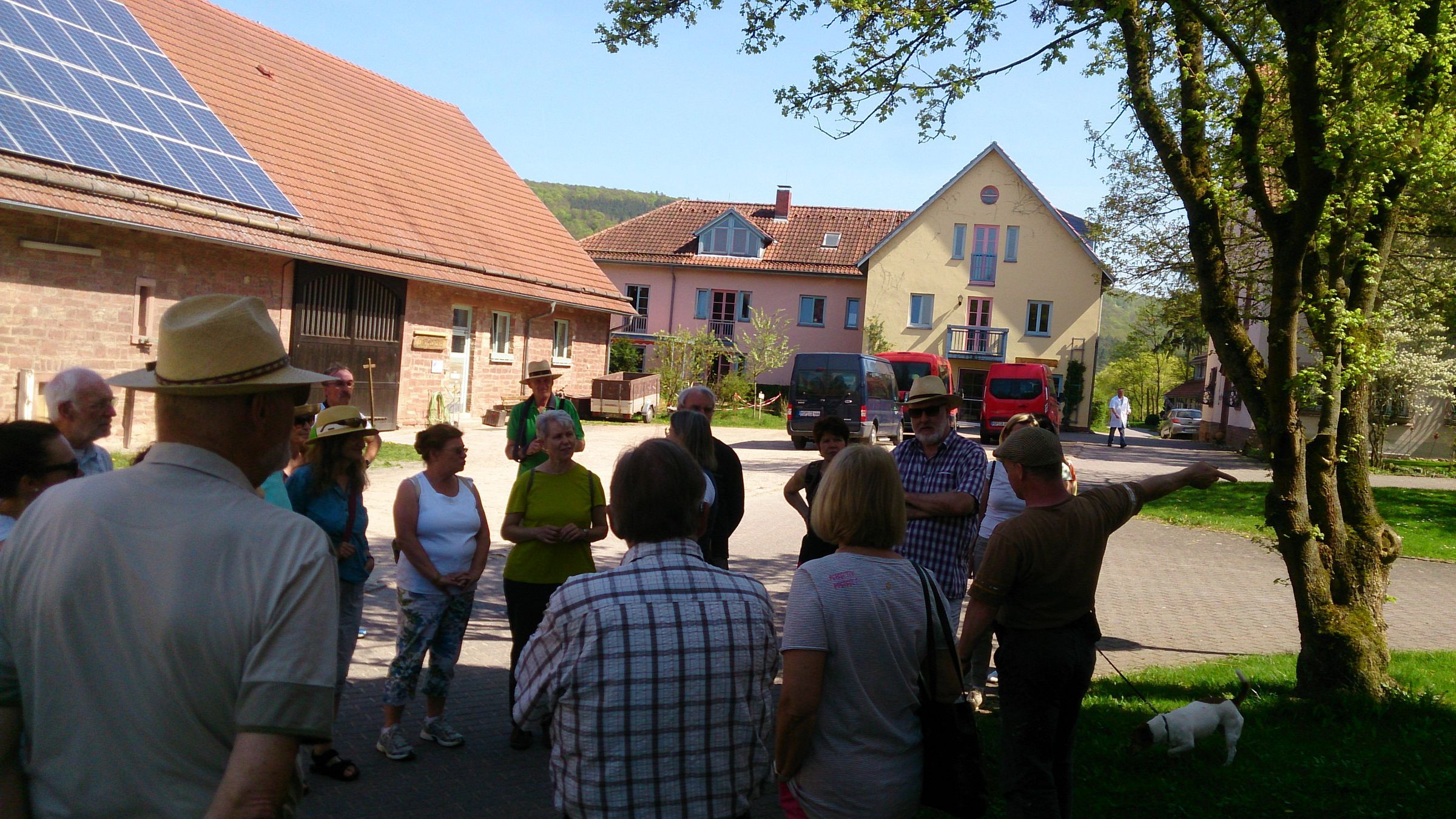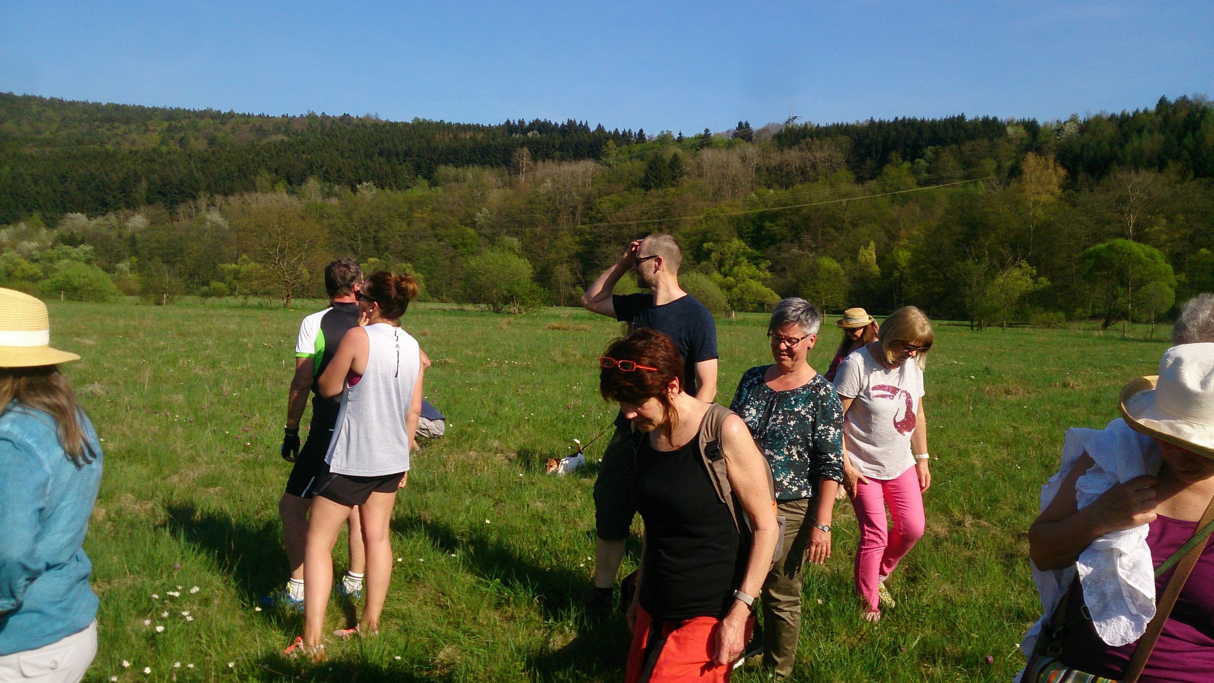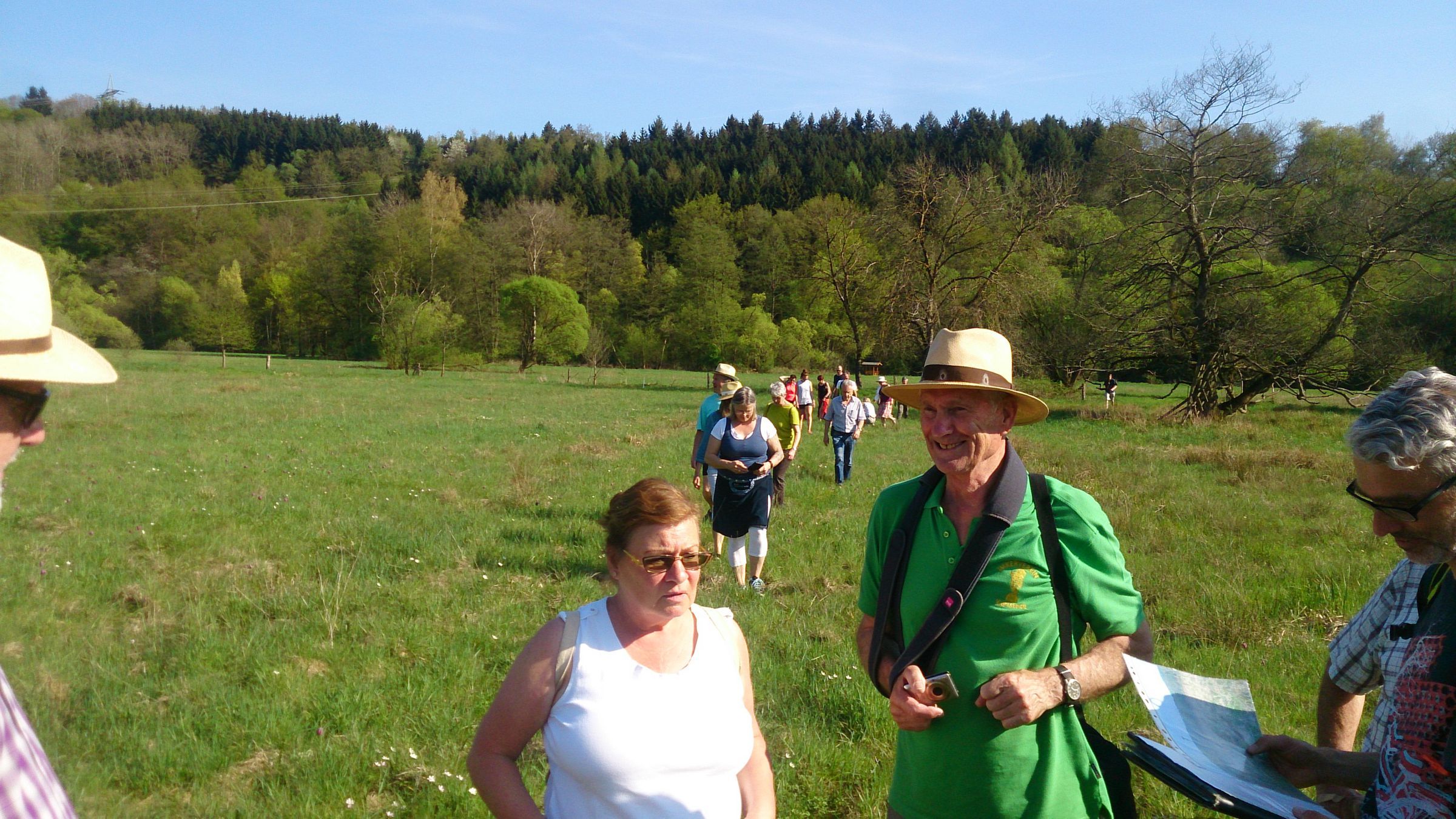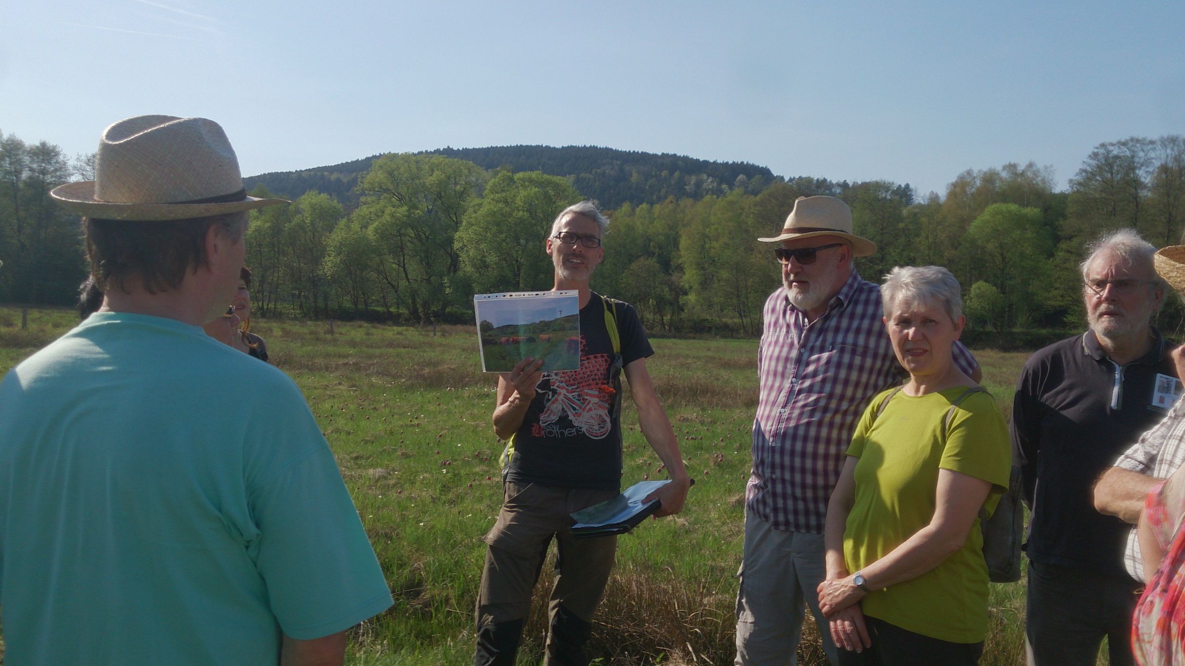 Dann wartete die zweite Überraschung: der Traktor des Landwirtes hatte kurz vor dem Besuch der Gruppe den Geist aufgegeben und Norman Belz konnte nicht zu den Schachblumenwiesen im Sinngrund kommen. Würdig vertreten wurde er jedoch von Torsten Ruf, Artenschutzbeauftragter des BN, der die Wiesen des BUND Naturschutz beim Gut Dürnhof präsentierte und eindrücklich die Zusammenhänge von zielartenorientierter Beweidung mit Schottischen Hochlandrindern und die Entwicklung der Artenzusammensetzung erläuterte. Die mit 8 ha größte Eigentumsfläche des BN im Landkreis wurde vor Beweidungsbeginn im Jahr 2014 gemäht bzw. lag ein Großteil seit vielen Jahren brach. Die Beweidung wird über ein Monitoring der Zielarten Schachblume und Dunkler Wiesenknopf-Ameisenbläuling begleitet. Im Gesamtergebnis ist eine Zunahme der Zielarten durch Steuerung der Weidezeitpunkte auf den drei Teilflächen, die an die Ansprüche der Zielarten angepasst ist, zu verzeichnen. Insgesamt sind sich BUND Naturschutz als Besitzer der Flächen und die Exkursionsteilnehmer einig, dass die Kombination aus Beweidung mit der Produktion von hochwertigem regionalem Rindfleisch und Naturschutz gelingt. Wichtig für Natur- und Klimaschutz ist nun noch beim Einkauf entsprechende Waren auszuwählen!