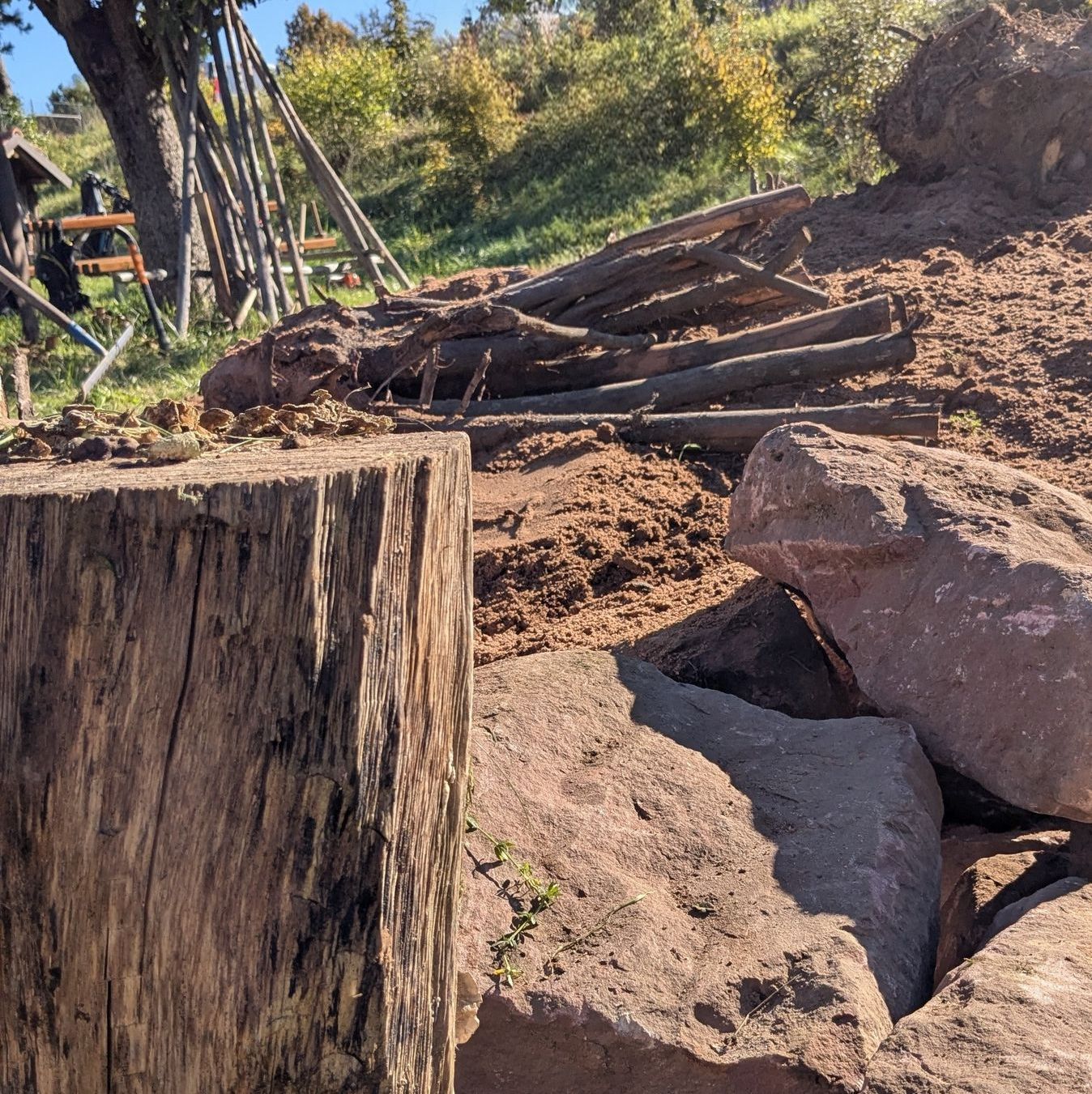 Dennoch gab es am Aktionstag für die Truppe noch viel körperliche Arbeit: in die vom Bauhof vorbereitete Grube wurden große Steine, Totholzstämme und Ziegel mit Hohlräumen gestapelt, dazwischen sandige Erde, Sand und kleinere Steine gefüllt, Äste und Wurzeln in die Zwischenräume gelegt. Abschließend wurde ringsum angeböscht und eine Sandlinse und Offenflächen für Kleingetier belassen. Dornige Kleinsträucher sollen Schutz und Deckung bieten.