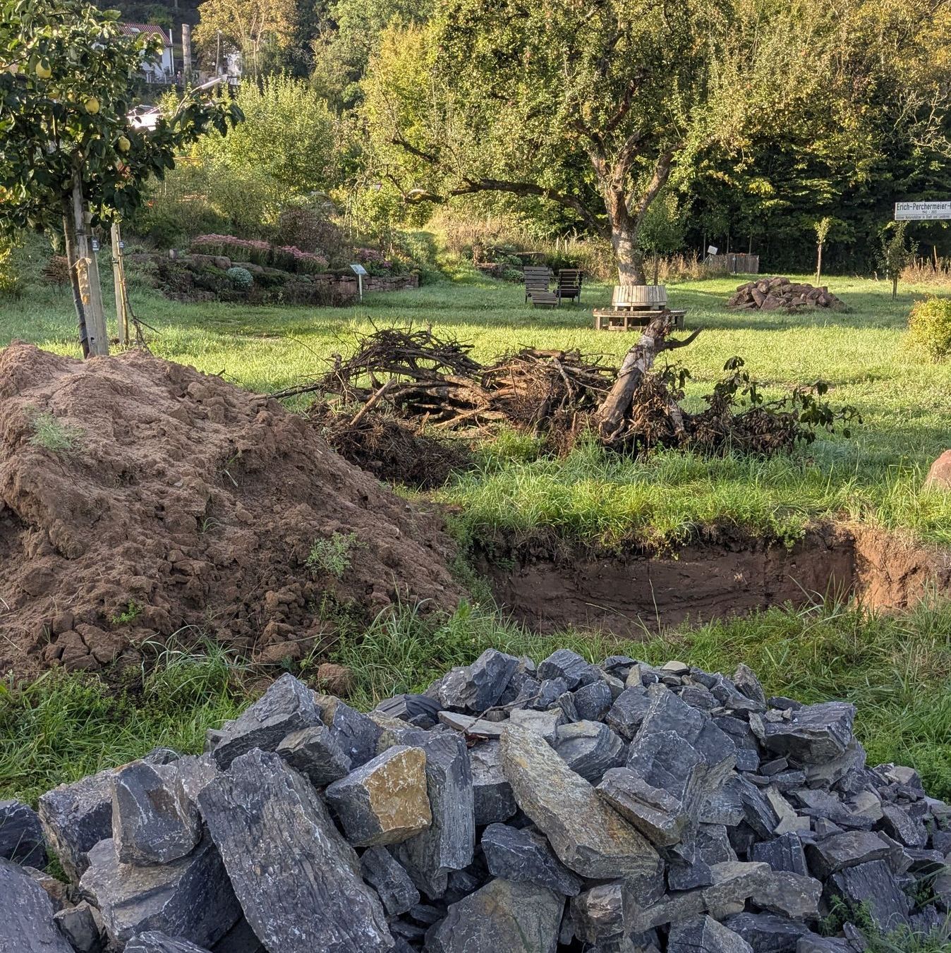 Mittlerweile ist es schon fast eine Tradition geworden, dass sich Auszubildende der Firma Flyeralarm im Rahmen eines sozial-ökologischen Projektes beim BUND Naturschutz Marktheidenfeld in den Lebendigen Gärten engagieren. Nach Aktion wie Gehölzpflanzungen, Bau von Rankobjekten oder Nistkästen haben sie jüngst zusammen mit Aktiven des BUND Naturschutz und der Rentnertruppe Silberlocke eine Eidechsenburg gebaut. Anleitungen dazu fand man in der Broschüre „Biotopbausteine zur Förderung der Biodiversität“ der Landesanstalt für Wein- und Gartenbau von Frau Dr. Beate Wende und im Buch „Strukturreiche Biotope selbst bauen“ von Marco Handel. Große Unterstützung beim Erdaushub und der Materialbeschaffung gab es vom Bauhof der Stadt Marktheidenfeld.