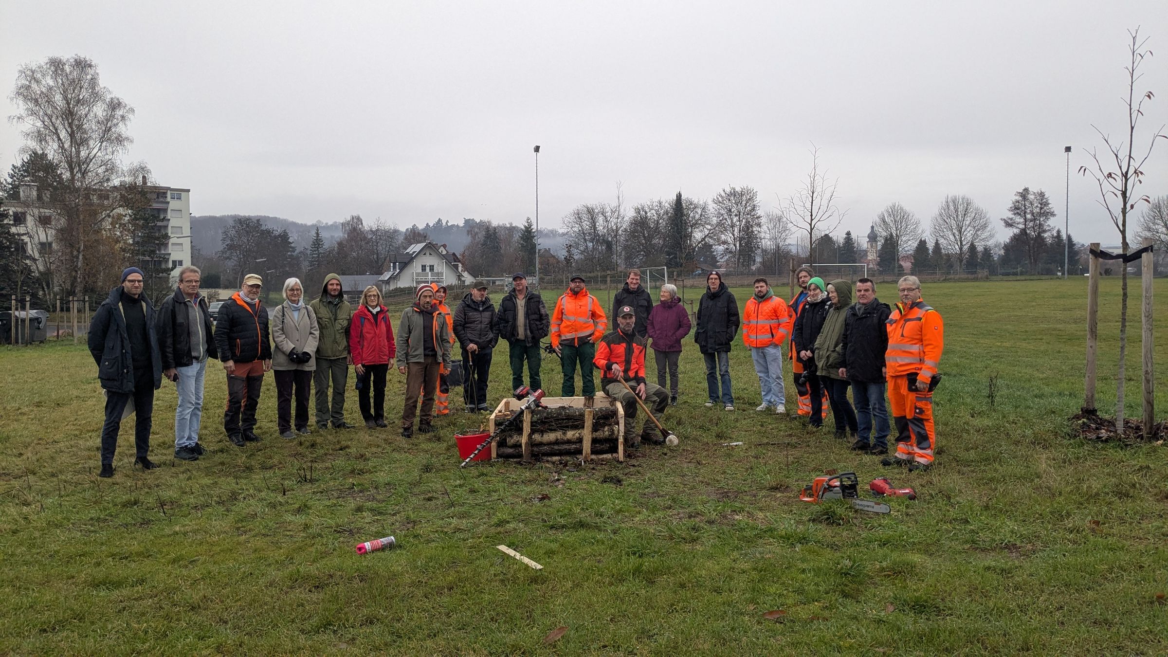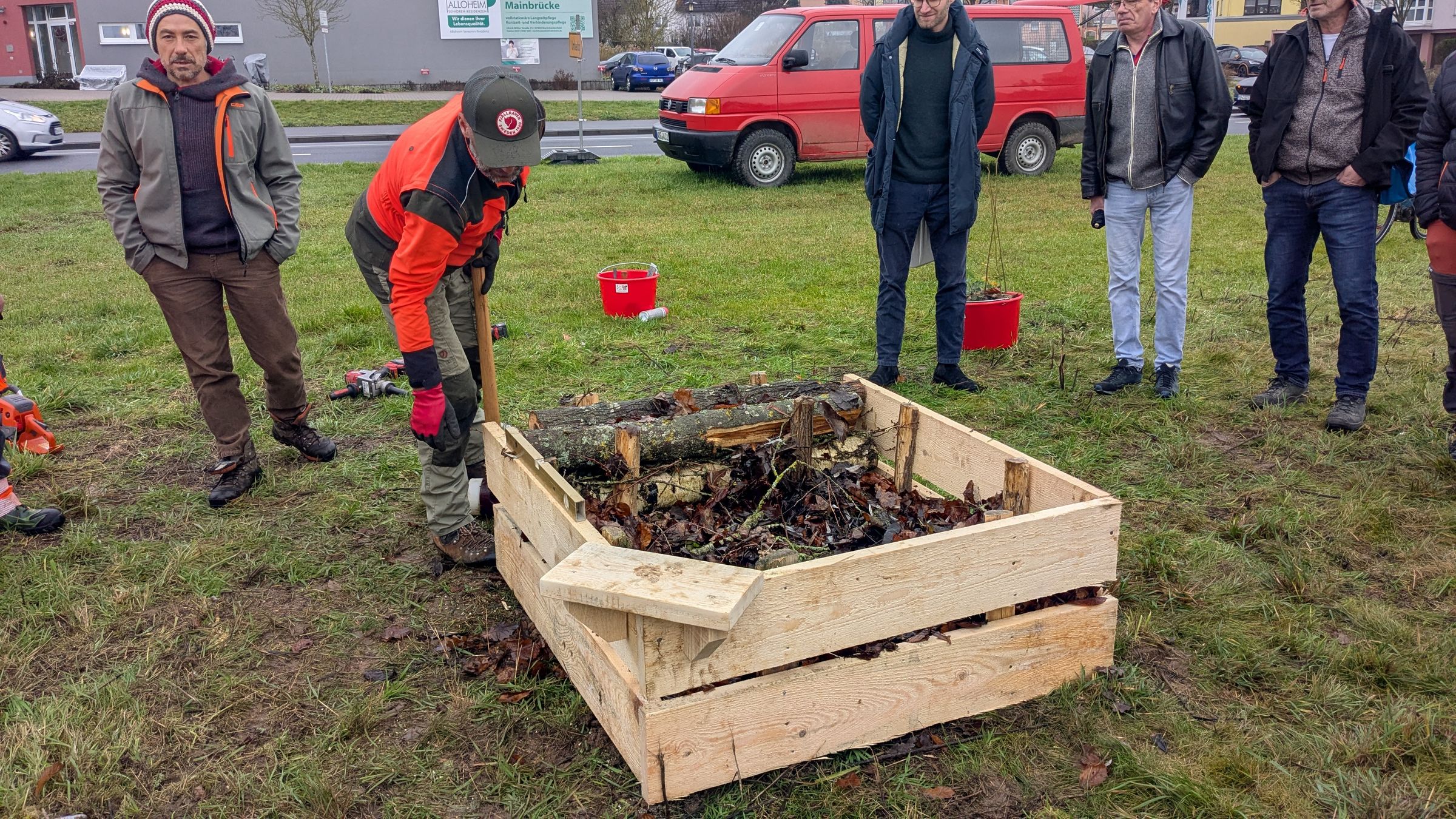 Im praktischen Teil des Runden Tisches zeigte Johannes Wagner den Teilnehmenden auf einer Fläche am Südring in Marktheidenfeld, wie ein sogenannten Affolder angelegt wird. In diesem ersten Schritt wurde der Rahmen installiert und der Boden mit Laub und Totholz präpariert. So entsteht ein waldartiger Standort mit viel Bodenaktivität als Voraussetzung für eine erfolgreiche Entwicklung der Sämlinge. Diese werden im späten Frühjahr an dieser Stelle eingepflanzt.