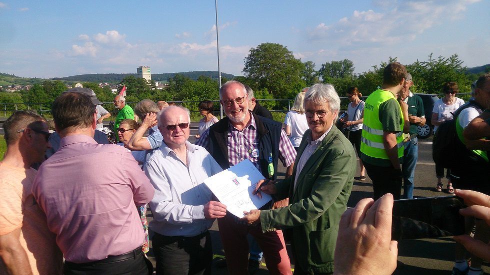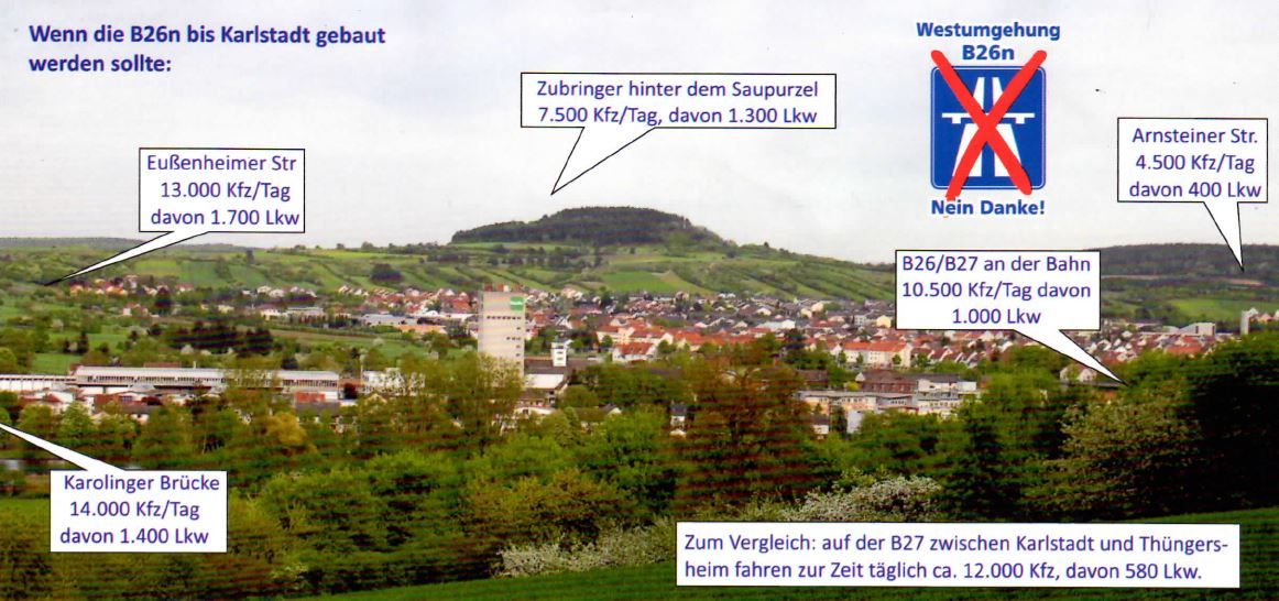 Der Verein Bürger und Kommunen gegen die Westumgehung/B26n e.V. und die Kreisgruppe des BN organisierten eine Protestkundgebung gegen die B26n in Karlburg. In seiner Rede erläuterte der neue BN Landesvorsitzende Richard Mergner die Position des BN und unterstützte die Postkartenaktion der B26n Gegner mit seiner Unterschrift.