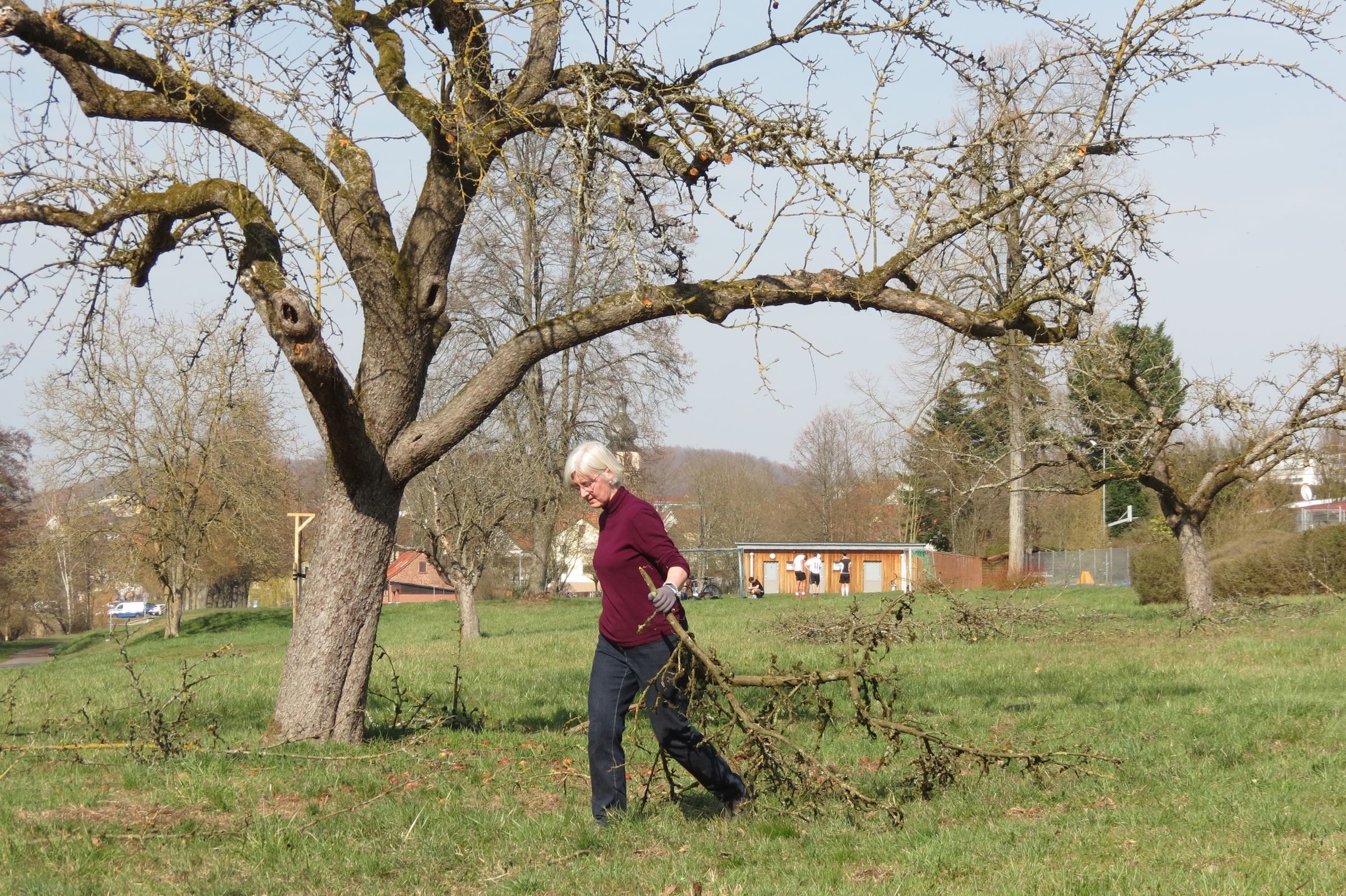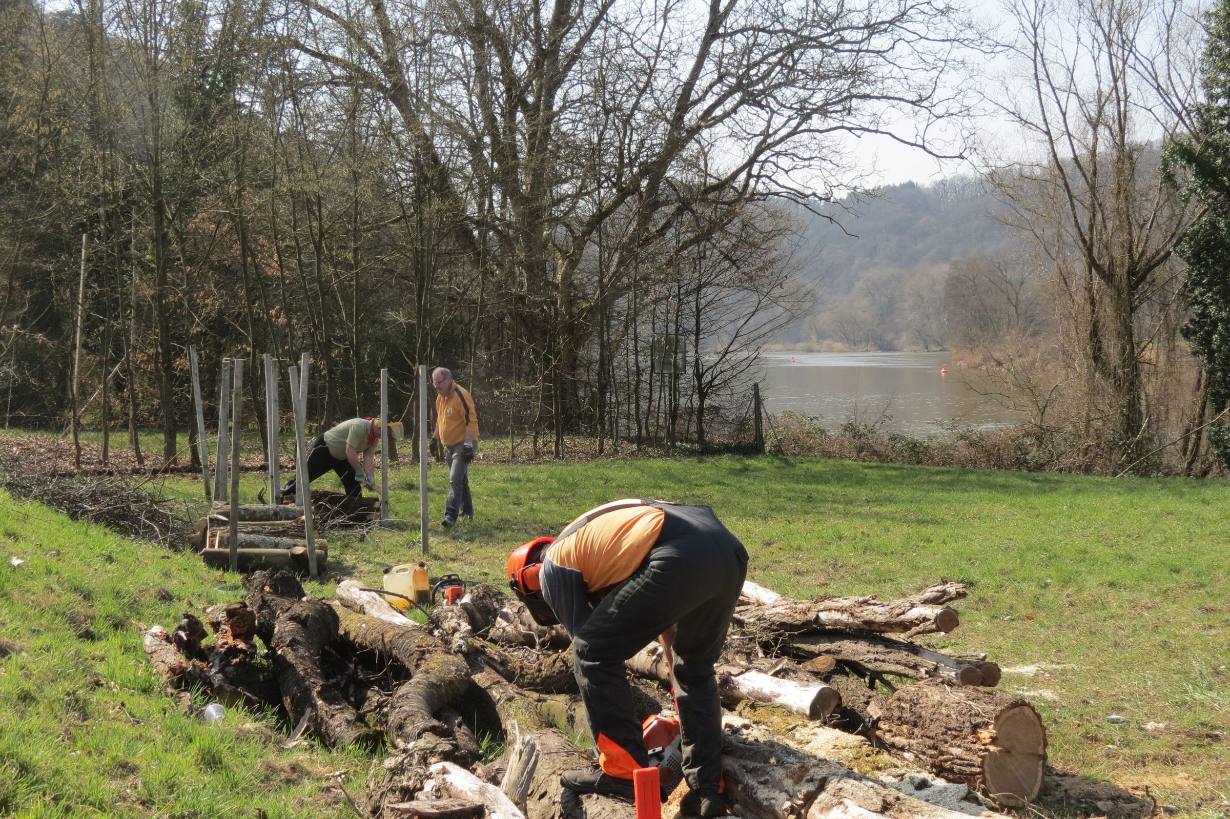 Auf den Wiesen lagerten von verschiedenen Schnittaktionen bereits Baumstämme und Astwerk. Beides wurde nun hangparallel aufgesetzt und soll künftig vielfältiger Lebensraum werden: vermutlich werden sich Flechte und Moose ansiedeln und Eidechsen, Kröten und Molche Schutz finden. Natürlich profitiert auch die Vogelschar davon. Im Winter werden Igel, Schmetterlinge, Marienkäfer und viele andere hier Schutz vor Kälte und Schnee finden.