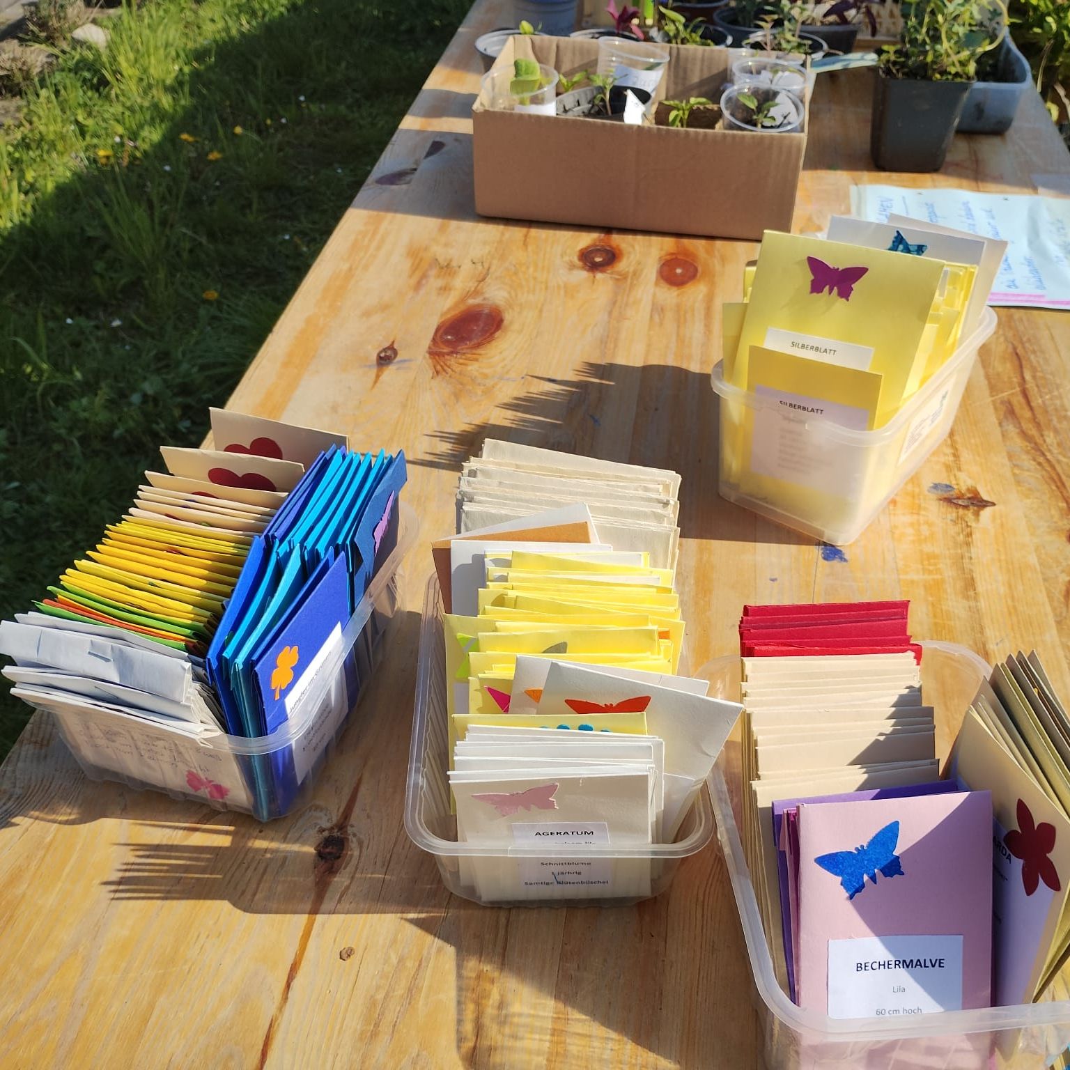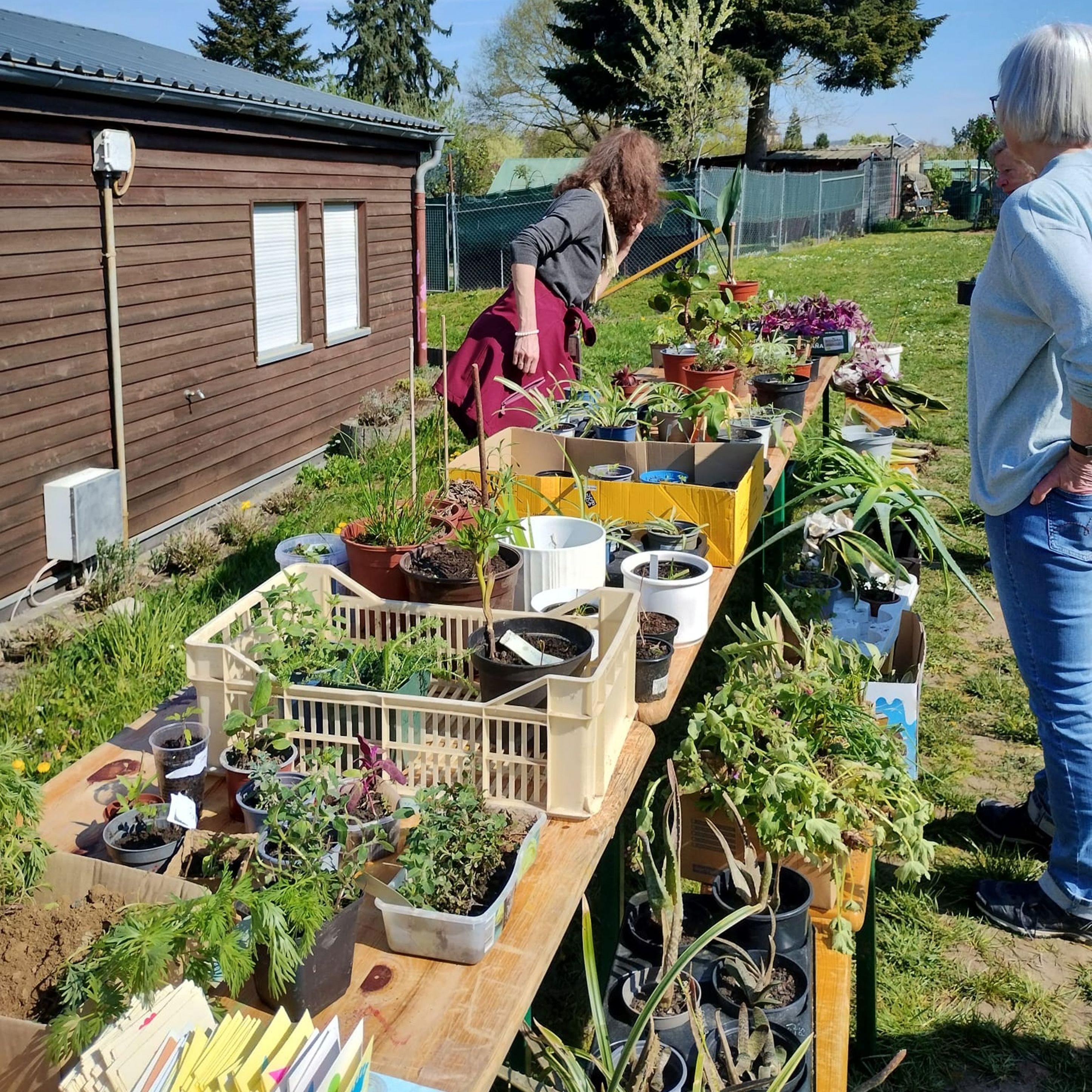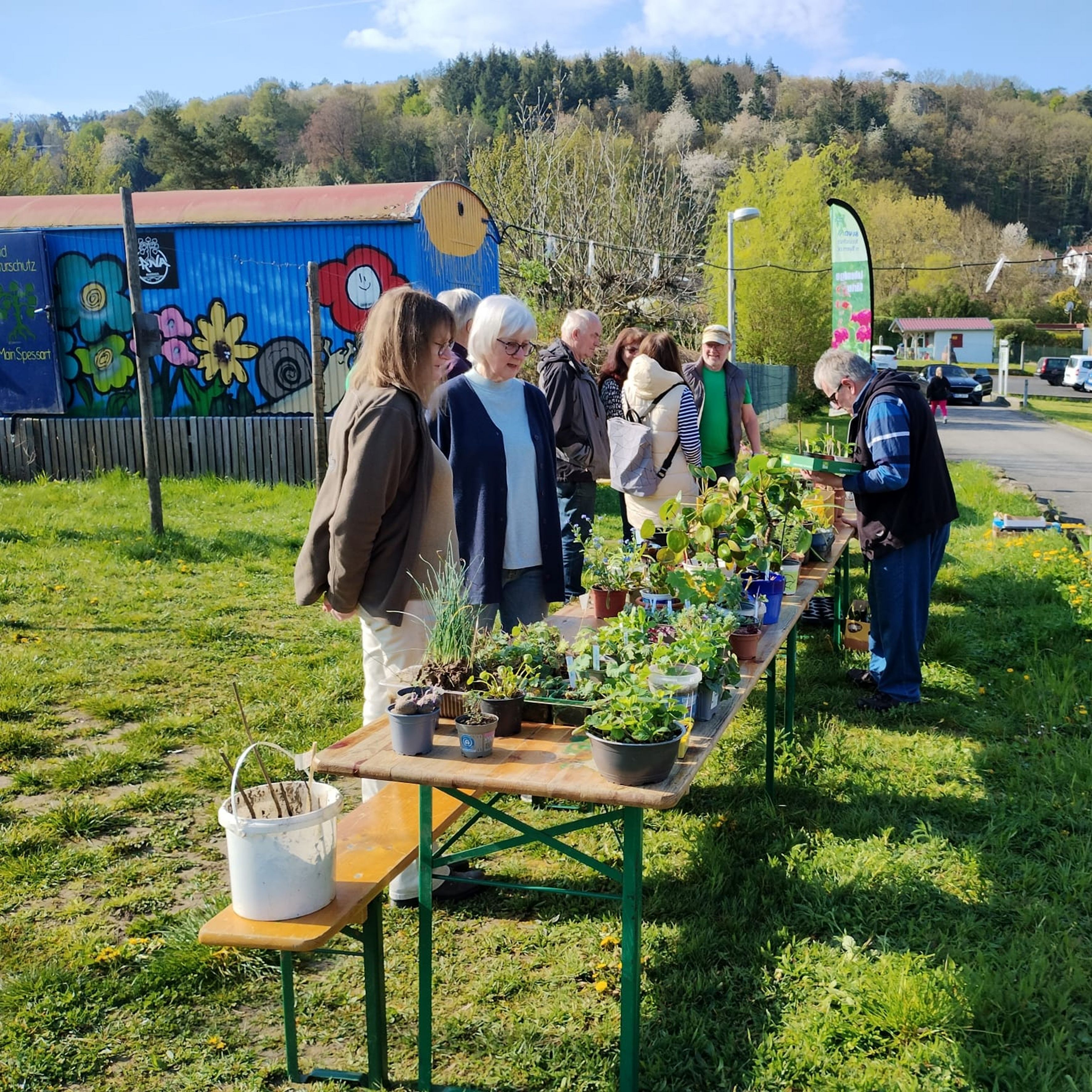 Zum dritten Mal fand am Samstag, den 18. April die Pflanzentauschbörse der Marktheidenfelder Ortsgruppe des BUND Naturschutz statt. Das Wetter meinte es gut und so kamen bei strahlendem Sonnenschein gleich zu Beginn zahlreiche Pflanzenfreunde teils mit vollen Kisten und Körben mit überzählig aufgegangenen Gemüsesämlingen, Blumen und Stauden, die im heimischen Garten zu ausbreitungsfreudig waren und daher im doppelten Wortsinn geteilt wurden, mit Kräutern und Zimmerpflanzen und auch ein paar Exoten, wie z.B. zwei Ablegern von Szechuanpfefferbäumchen. Es wurde gefachsimpelt über Bodenansprüche, Aussaattermine und Lieblingssorten von Tomaten. Und so manche samenfeste Gemüserarität wird nun in neuen Gärten eine Heimat finden. Auch einige Kästchen mit kleinen, liebevoll gestalteten Blumensamentütchen wurden eifrig durchsucht und es fanden sich dankbare Abnehmer für zweifarbige Akeleien und sonstige Schönheiten.