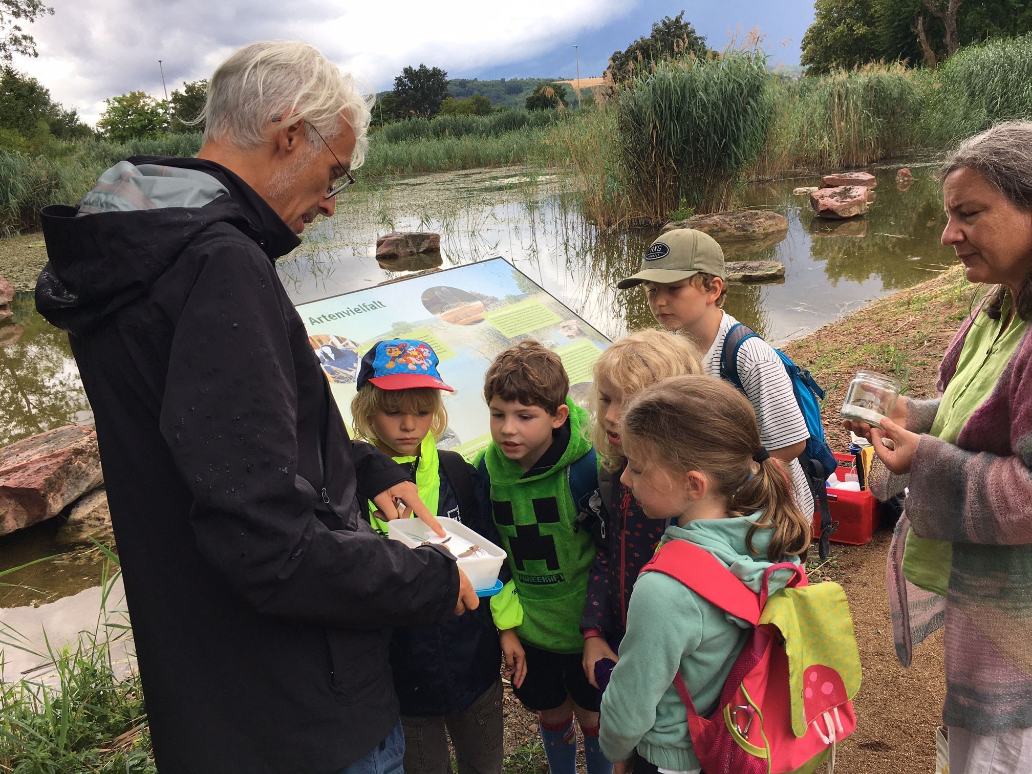 Zum Abschluss durften die jungen Naturforscherinnen und -forscher mit Becherlupen und Keschern selbst aktiv werden und Kleinstlebewesen am Ufer erkunden. Nach einer kleinen Stärkung in einer Regenpause wurden sie schließlich von ihren Eltern abgeholt.