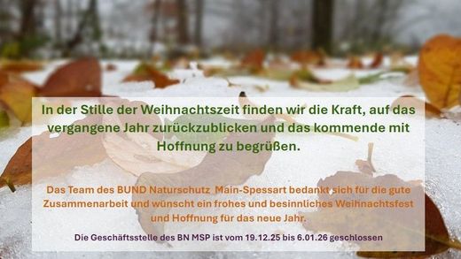 Auch wir machen jetzt erst mal Winterpause und schließen unsere Geschäftsstelle vom 19.12.25 bis 6.01.26. Aber in dringenden Fällen findet man Ansprechpartner*innen auch hier oder da. Nun freuen wir uns bereits auf ein Wiedersehen im Neuen Jahr bei unserer Jahreshauptversammlung am 27.März in Karlstadt in den Mainpromenaden, bei den vielfältigen Ortsgruppenangeboten oder im Gelände bei Exkursionen oder praktischen Aktionen.